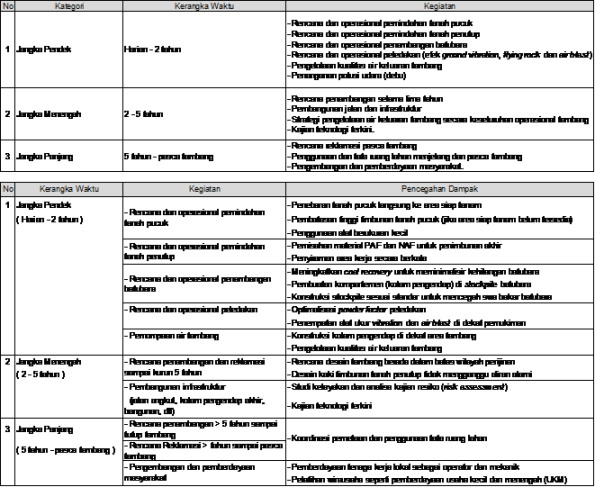 | Hindari interaksi langsung proses ataupun dampak kegiatan tambang dengan aktvitas masyarakat misalnya penggunaan jalan angkut overburden dan batubara yang sama dengan jalan umum, pembangunan stockpile batubara terlalu dekat dengan pemukiman penduduk dan lain-lain. | |||