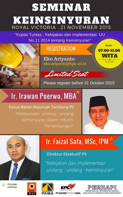 Salah satu program dari divisi Working Group PERHAPI KUTIM adalah mengadakan seminar/workshop setiap 3 bulan yang menghadirkan pembicara dari luar dan mengambil tema yang sedang hangat saat ini. Pada Edisi bulan November 2015 (Q3 2015) ini mengambil tema Kupas Tuntas: UU No.11 Tahun 2014 Tentang Ke Insinyuran. Materi ini sedang hangat dibicarakan, karena tentunya akan berimbas bagi praktisi Industri pertambangan, karena semua aktifitas perencanaan maupun eksekusi pertambangan melibatkan para orang-orang yang dalam undang-undang ini disebut sebagai Insinyur.